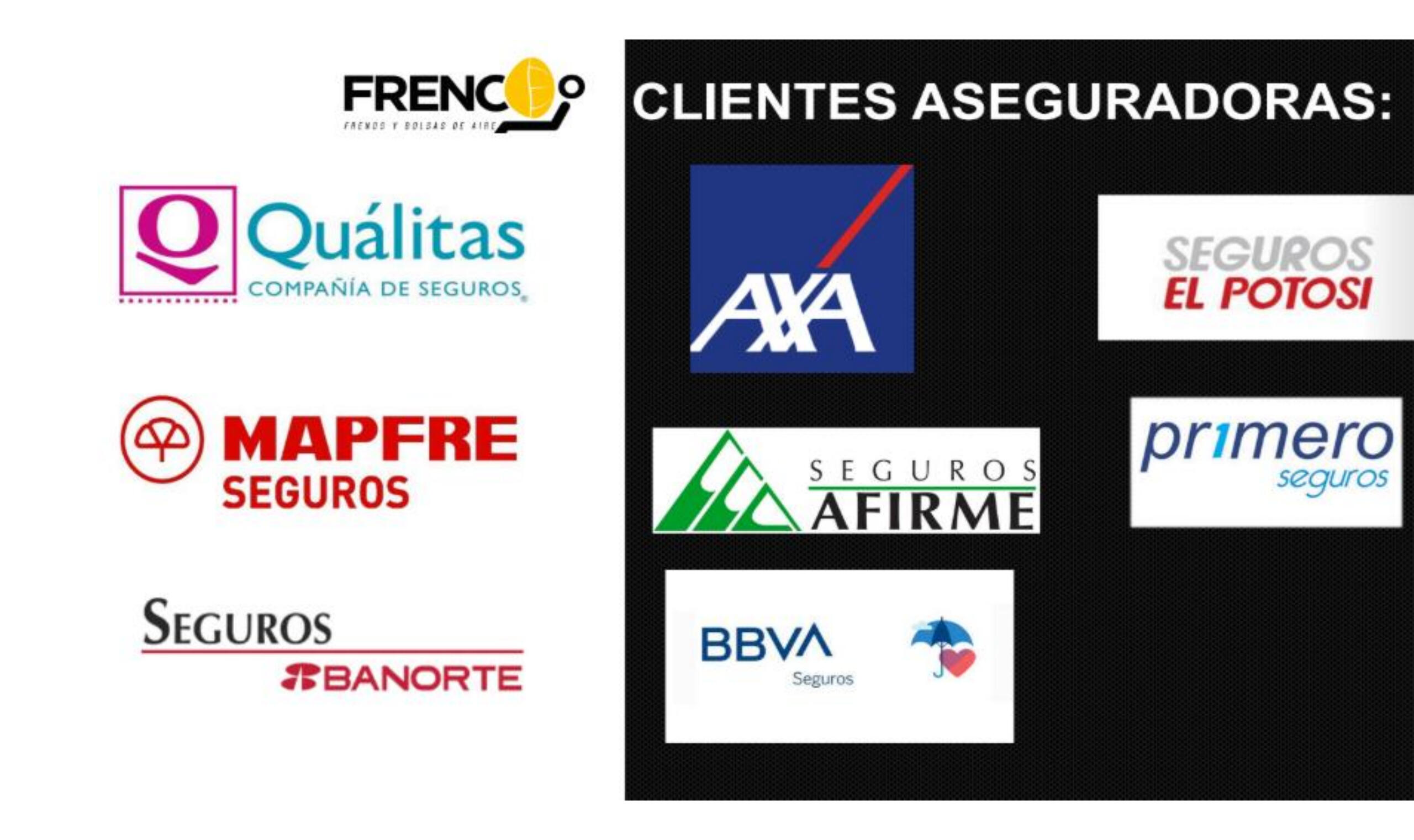 Frenco es proveedor autorizado de las principales aseguradoras de México. Desde 2016, trabajamos con líderes del sector para ofrecer soluciones de mecanica y seguridad automotriz de alta calidad, garantizando rapidez y confiabilidad en cada servicio.